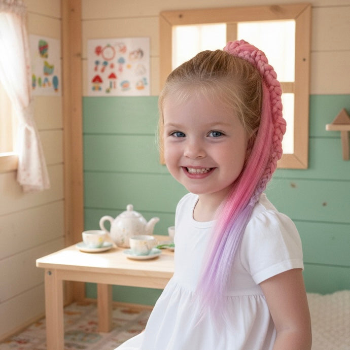 We are obsessed with the beautiful pastel colours in this ponytail. They are the perfect accessory for magical dress-up adventures